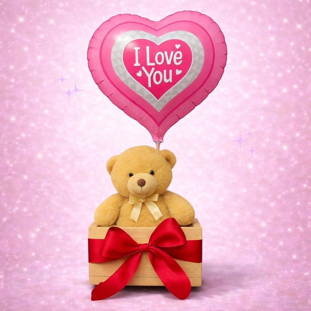 Caja con oso peluche y globo “I Love You”