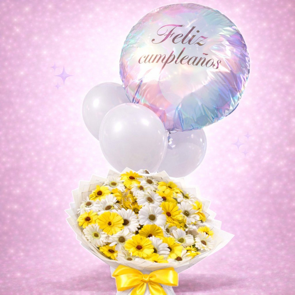 Ramo de gerberas amarillas y blancas con globos “Feliz cumpleaños”